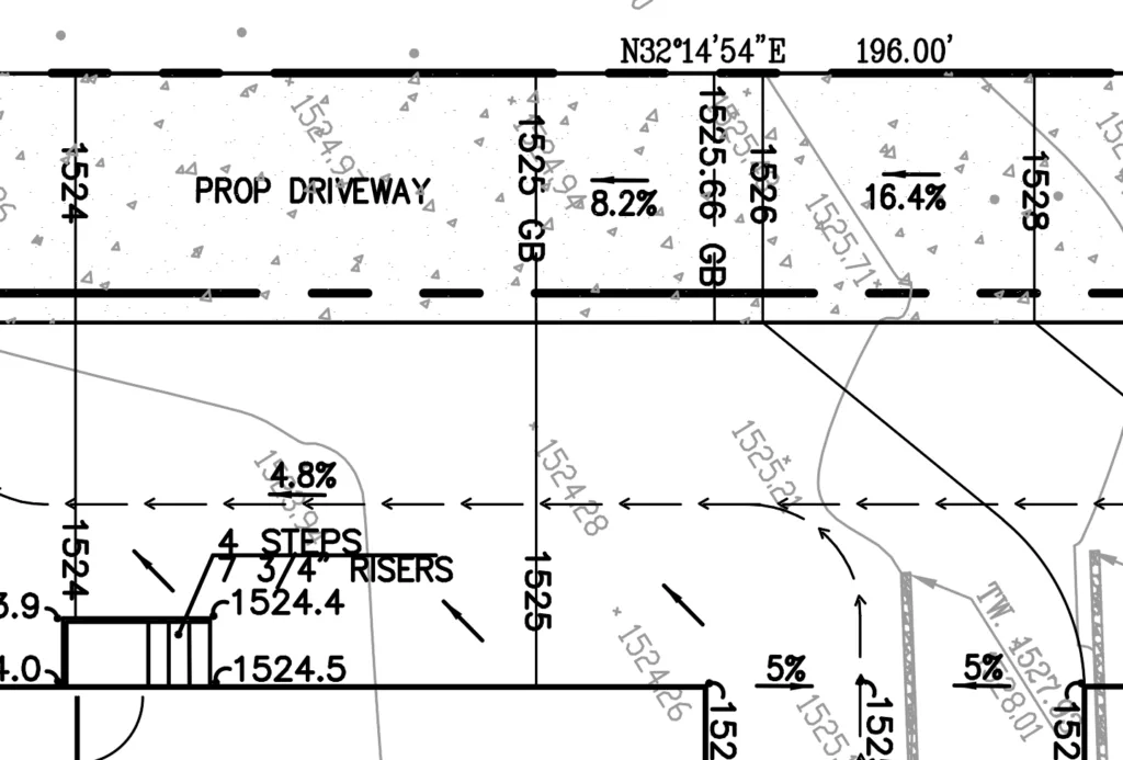 On this particular lot we were able to sheet flow by gravity the entire site to the rear, without needing area drains. The next step was locating a proposed driveway that connects to the existing driveway apron without building walls or curbs. This part was eyeballed to guess an initial grade and length that would work, then using our custom calculator we could line up the proposed contours and grade breaks and align that with the existing property line elevations. Like usual got this on the first try and had a very good tie in with the neighbor our driveway and how the ADU’s sit. This is not a flat lot and averages about 17% from front to rear because of stepped walls through the property.
