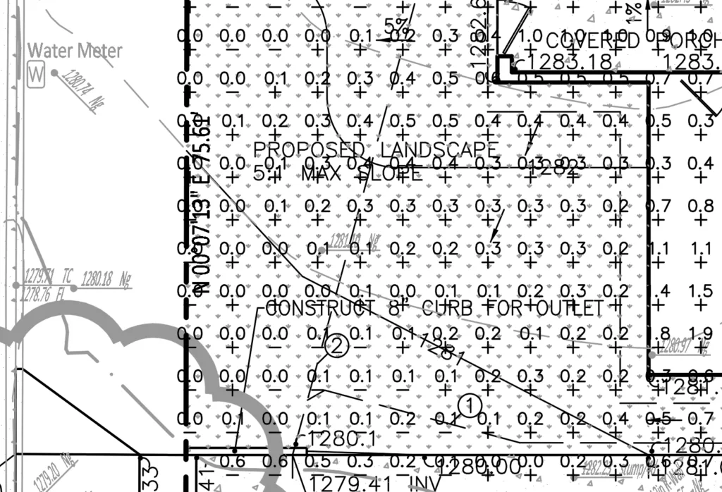 Going around the site trying a few different elevations, the Architect mentioned they wanted the rear garage to also have the same finished floor as the multi-unit structure. Which meant that furthest rear corner wants an area drain with piping to get to the driveway. Ramping up quickly we can design a position for a curb to bring the pipe out through to the driveway. They also wanted to put a new driveway apron in which this street has those funny driveways that go over the flowline. We put in a proper County standard apron and started to ramp up quickly after the property line. This set the pipe invert which brought us back to that furthest corner. Go 8in above that landscape and area drain elevation to set the finished floor of both the structure and the garage and now we can get to putting more elevations in. One thing I notice is these deeper sideways lots with a building taking up most of the lot, are going to need short retaining walls, most likely on North and South to try to even out the elevation set by the buildings. The walls my wrap slightly to try to contain more water, as this time we are not going to use plastic lined rain gardens.