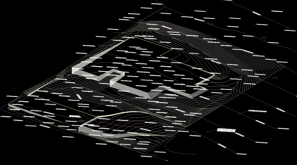 This Altadena Drainage Plan is a corner lot fire rebuild. The proposed house sits in a similar location but we need to adjust the existing contours to keep 5% slope 10 feet from the structure at the top. From there we create a flowline that wraps around both sides of the house, which eventually ends up sheet flowing this flowline towards the street. The surveys are still pretty hard to read with the way the existing foundations were removed, so we are still using the property line elevations as the guide and adjusting inside the lot.